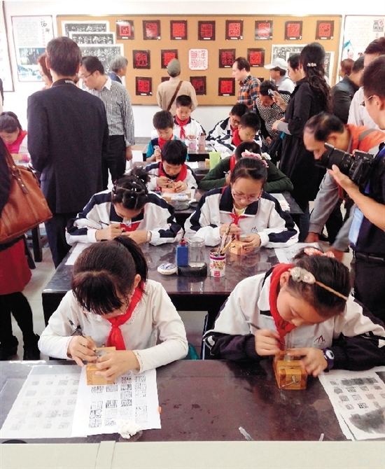 唯亭实验小学的传统文化课程非常丰富,除了国画与书法,还有篆刻、剪纸、刺绣等课程。在篆刻课上,同学们的作品让到场的书法家们也交口称赞。