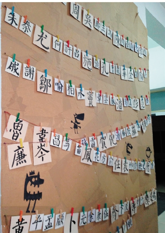 翰林小学校园内的书画展示别具特色,学生自己绘制的团扇一字排开悬在屋顶,写满书法的毛边纸直接用来装饰墙面,就连楼梯扶手上也从上到下挂满了写在竹片上的三字经,花费不多却意趣盎然。