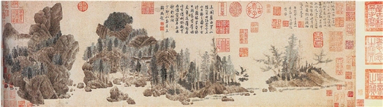 元代钱选《浮玉山居》,虚斋旧藏,现藏上海博物馆。该作品上有300余方印章。