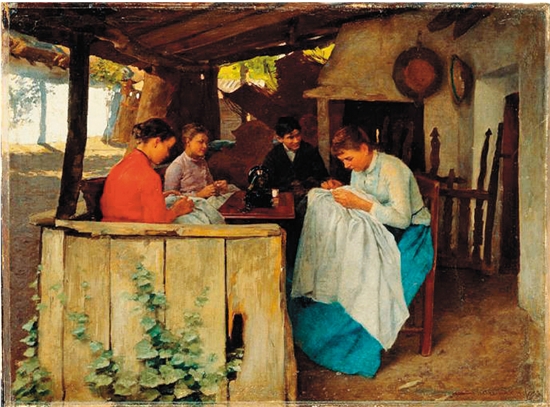 桑德尔·比哈里 凉台上的针线女工 约1900年 帆布油画
