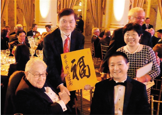 2014年11月应邀出席美中关系全国委员会年会,向美国前国务卿基辛格博士赠送“福”字书法。