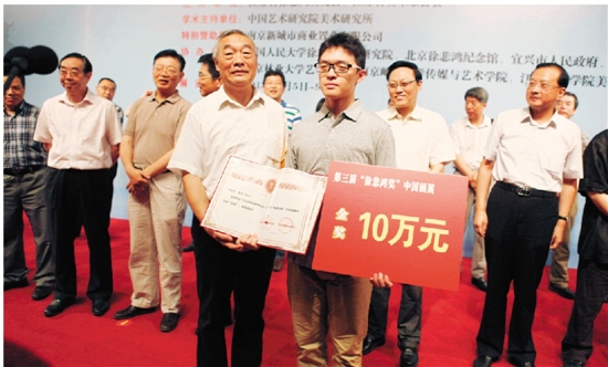 徐庆平教授(左)为第三届“徐悲鸿奖”中国画展金奖作者颁奖