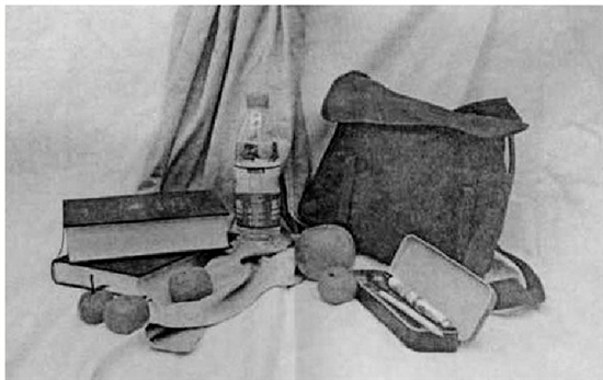 色彩:根据提供的图片和物品,完成一幅偏绿的亮灰色调静物画。一个文具盒,两本书,一个书包,一瓶矿泉水,一个苹果,4个橘子,3枝笔、两块衬布。