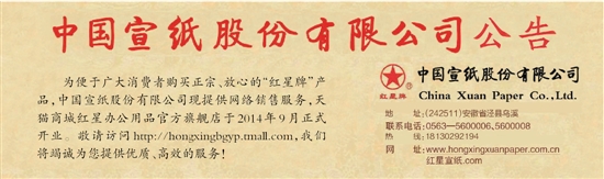 为便于广大消费者购买正宗、放心的“红星牌”产品,中国宣纸股份有限公司现提供网络销售服务,天猫商城红星办公用品官方旗舰店于2014年9月正式开业。敬请访问http://hongxingbgyp.tmall.com,我们将竭诚为您提供优质、高效的服务!