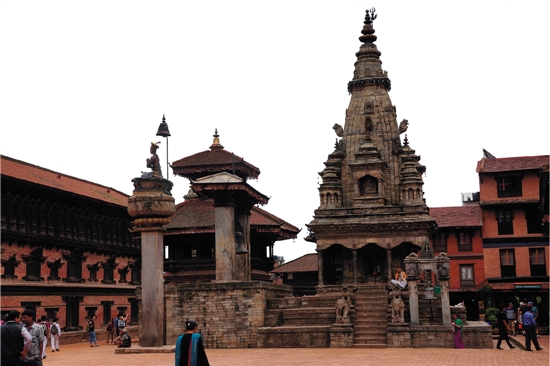 广场的前面是印度教的锡哈拉式塔,旁边是尼泊尔式塔,前面是伽楞频鸟石柱。
