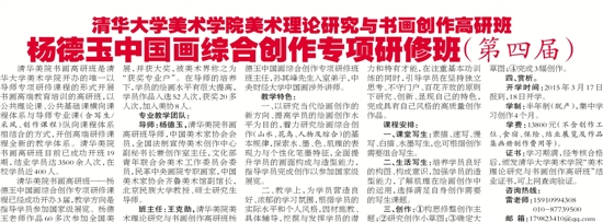 清华美院书画高研班——杨德玉中国画综合创作专项研修课程已经成功开办3届,教学方向是指导学员参加国家级展览。杨德玉老师作品60多次参加全国美展,并获大奖,被美术界称之为“获奖专业户”。在导师的培养下,学员的绘画水平有很大提高,学员作品入选52人次,获奖20多人次,加入美协8人。