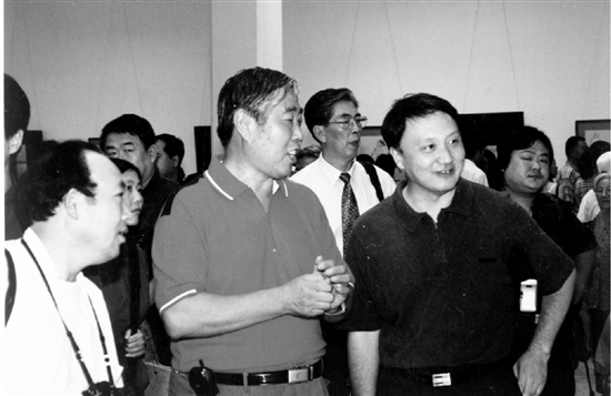 北京市文化局副局长、北京画院院长、著名画家王明明在中国美术馆边看刘泽文速写作品边与作者交流。
