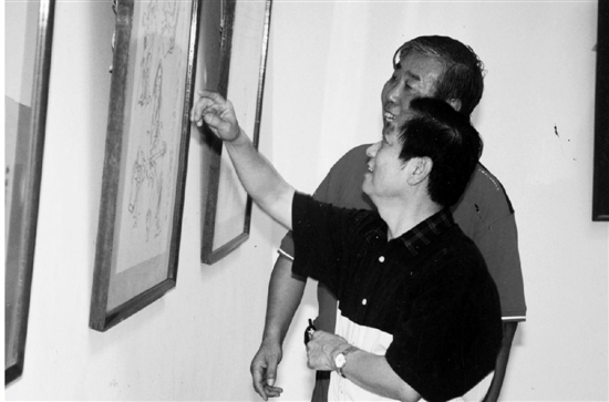 著名艺术家韩美林在中国美术馆饶有兴致地观看刘泽文速写作品。