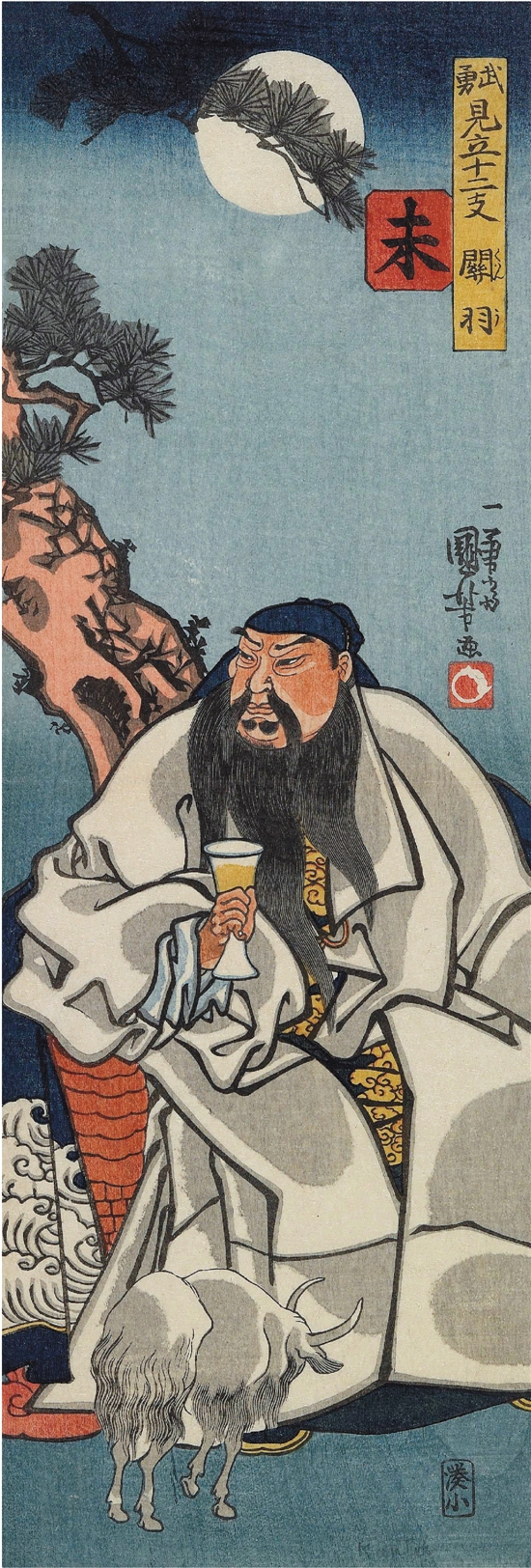 日本 歌川国芳 勇士与十二地支:关羽和羊 木版画