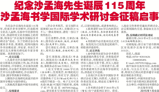 为纪念沙孟海先生诞辰115周年,传承沙老书学精神,打造鄞州文化名人品牌,弘扬中华民族传统文化,推进传统文化在国际上的传播,特举办“沙孟海书学国际学术研讨会”活动。为了使研讨会办得更具学术性、规模性,现特向国内外书法理论家、评论家、书法艺术家以及从事相关研究的专家学者征稿。具体事宜如下:
