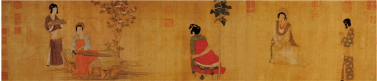 | 明 佚名 仿周昉调琴啜茗图 130×28.4cm 辽宁省博物馆藏 《调琴啜茗图》,又名《弹琴仕女图》、《宫妓调琴图》,传为周昉所作,并为其仕女画的代表之作。图绘3位坐于庭院的贵妇,在两位侍女的陪伴下,或把弹调音、或托盏品茶,表现出贵族妇女闲散恬静的生活。《调琴啜茗图》现存多幅摹本,如纳尔逊-阿特金斯艺术博物馆收藏的完成于宋代的绢质摹本、弗利尔美术馆收藏的绘制于明代的纸质摹本、京都国立博物馆收藏的带有仇英款的绢质摹本。极为巧合的是辽宁省博物馆收藏有两卷《调琴啜茗图》,一件为清宫旧藏,曾经《石渠宝笈》续编著录,署款“周昉”,实为后人仿本。另一件则为清代扬州画家管希宁所摹。两件与前述作品均作同一主题内容,此件为清宫旧藏之本。 |