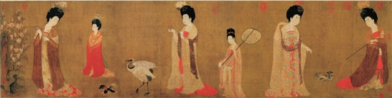 | 唐 周昉 簪花仕女图 180×16cm 辽宁省博物馆藏 唐代是仕女画的繁盛时期,当时张萱和周昉的仕女画被奉为“张家样”和“周家样”,成为一代楷模。现藏于辽宁省博物馆的这一件周昉《簪花仕女图》,展现了唐代宫廷嫔妃骄奢闲适生活的一个侧面。全图分为“戏犬”、“慢步”、“看花”、“采花”4个情节。图卷右起是一位身披紫色纱衫的贵妇,手执拂尘侧身转首逗着一只摇尾吐舌的小狗。另一贵妇则肩披白纱,身着罗裙,右手挑起纱衫,左手招弄小狗。两人形成响应。另一贵妇凝视着手中的小花,似在沉思。其身后站着一个手执长柄团扇的侍女,低眉顺眼。再向前又一贵妇手里捏着一只蝴蝶,回首望着悠闲的白鹤。远处还有一位身披自纱的贵妇,娉婷而来。整个构图远近高低,错落有致。人物形象则丰腴肥硕,神态安闲。勾线劲细流畅,风姿毕现。设色富艳浓丽,显出肌肤的质感和服饰的轻薄。以写实的表现手法传达出雍容的情致。此图的衬景如玉兰、仙鹤、拂葆狗也反映了当时花卉。 周昉(生卒年不详),字仲朗,长安(今西安)人,官宣州长史。他游于宫廷与豪门之间,常见贵而美的妇人,对她们的生活十分熟悉,因而所绘仕女十分精妙,为中晚唐时期人物画的主要代表画家之一。 |