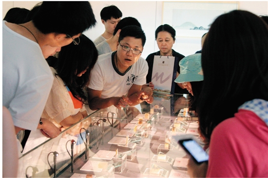 “三百石印富翁——齐白石的金石心迹”展览期间,北京画院美术馆组织了多种多样的公共教育活动。图为北京画院美术馆展览部编辑为团体参观讲解展品。