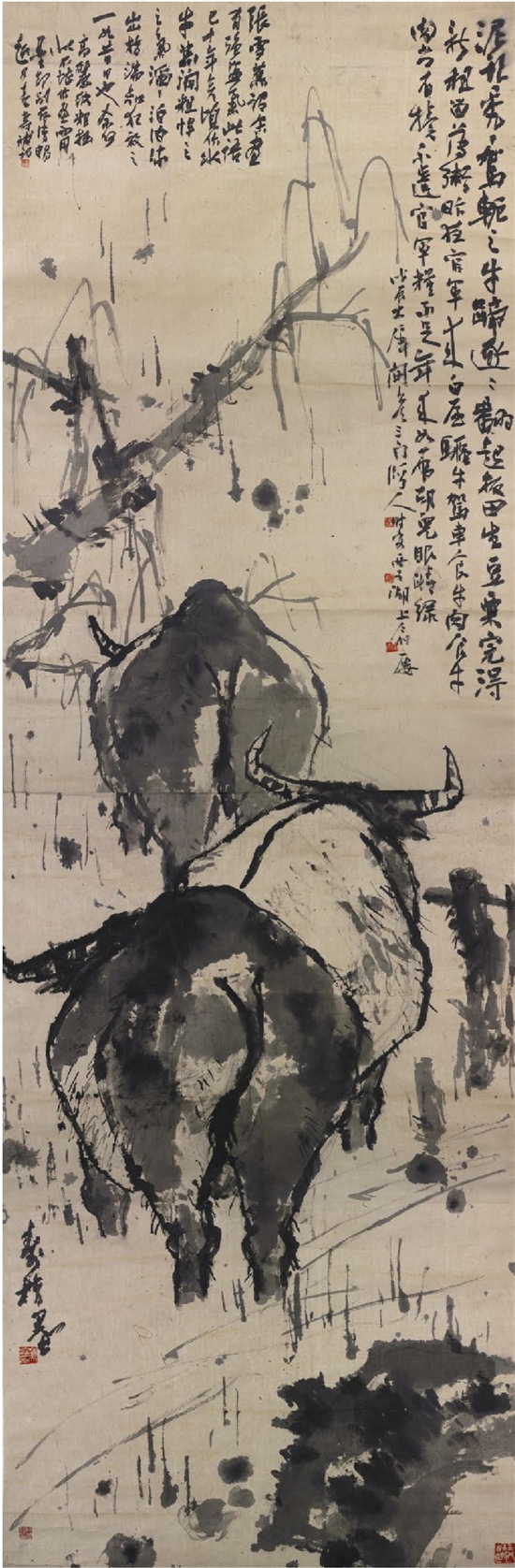 | 潘天寿 牧牛图 纸本水墨 178×53.5cm 1928年 款识一:泥头秃秃,驾轭之牛蹄逐逐。翻起板田生豆粟,完得新租留薄粥。昨夜官军来白屋,驱牛驾车食牛肉。食牛肉,尚有犊。不遣官军粮不足,年来如虎胡儿眼睛绿。戊辰木犀开候三门湾人时客西子湖上俞楼。 款识二:张雪蕉谓余画又强盗气,此语已十年矣。顷作水牛荒涧粗悍之(之)气滔滔泊泊流出指端,知狂放之一如昔日也。奈何?高丽纸粗拙,似不堪作画,而用墨又别存清畅趣。可喜。寿补记。 款识三:寿指墨。 印章:天寿小鉨(白)、阿寿(朱)、天寿之印(白)、潘天授印(白)、三门天授近作(白) |