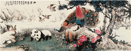 在庆祝中华人民共和国诞辰60周年之际,作者怀着无限激动的心情,整整用了一个季度的时间,精心、巧妙构思,创作了此巨作。作者把山水、花鸟、熊猫、孔雀等巧妙地融合在一起,既是一幅壮美的花鸟画,也是一幅气势磅礴的山水画。画面中以两只国宝熊猫为主体,象征可爱的祖国正在走向辉煌;以鲜艳的孔雀,象征伟大的祖国前程锦绣;空中翱翔的6只和平鸽,象征建国60周年祥和美好;再与熊猫、孔雀遥相呼应,十分和谐。青松和翠竹与大好河山交相辉映,赞颂祖国万古长青和中华儿女虚心高节、艰苦奋斗的崇高品格。整个画面立意高远,内涵丰富,寓意深刻,和美壮观,美不胜收。 ——轩辕九夕 |