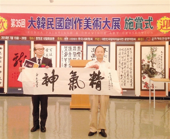 图2 余新志将巨幅书法《精气神》赠送韩国书画协会珍藏。(这是金克善主席接受作品情况)