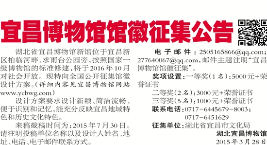 电子邮件:2505165866@qq.com;277640067@qq.com,邮件主题注明“宜昌博物馆馆徽征集”。