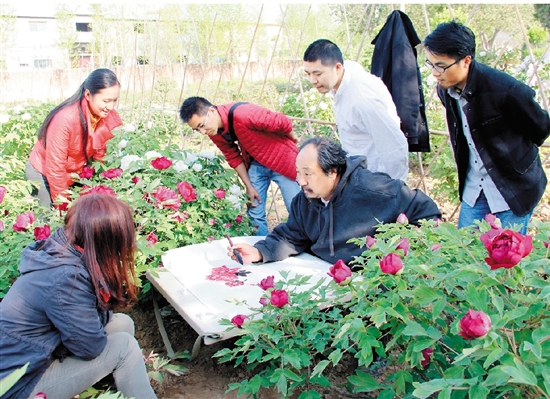 2015年春,清华大学美术学院中国画高研班学生孙晓芳、吴殿玉、张连刚、涂杰新、卢玉萍等在菏泽曹州百花园看导师杜月涛教授做牡丹花写生示范