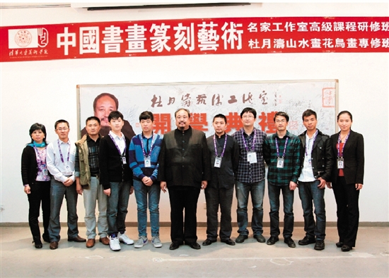2013年秋,孙晓芳、吴殿玉、张连刚等清华大学美术学院中国画高研班杜月涛艺术工作室全体同学与导师杜月涛教授在清华大学美术学院课堂开学典礼时的合影