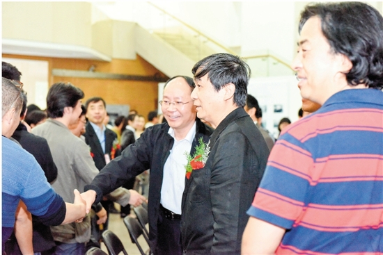 西安美术学院党委书记王家春(中)、院长郭线庐(右二)、副院长宋晓峰(右一)与嘉宾握手
