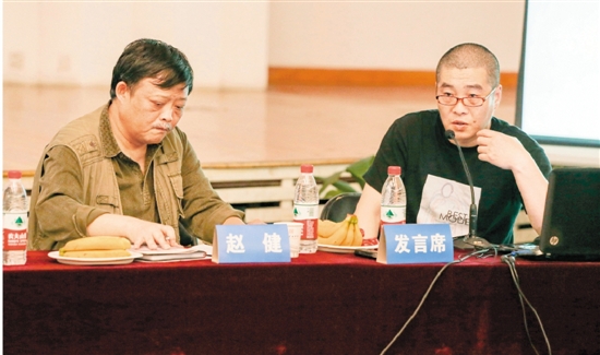 西安美术学院高等教育研究中心副主任赵健与中国美术学院专业基础教学部总部主任曹晓阳在研讨会上
