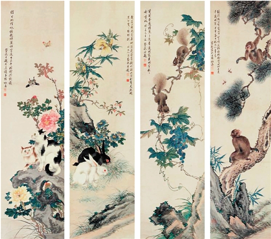 蔡铣 动物花鸟 四屏 甲申(1944年)作
