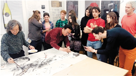 捷克国家美术学院也是有200多年历史的国立美术院校,5月4日,在捷克国家美术学院讲学时,气氛更为热烈,画桌四周里三层外三层,挤满了学院油画系、版画系、雕塑系和工艺设计系的学生们,有拍照的,有录像的,有拿自己的画作请求指点的,更有在展品前提问求答的,互动研讨热烈,学术气氛浓郁。刚从中国上海办个人画展归来的该院院长弗拉基米尔·可可利亚先生从头到尾亲自拍摄了吴静初、倪伟林演讲和书画创作的全过程,并表示一定要好好观赏,细细品味。同样的,捷克国家美术学院也首次珍藏了吴静初、倪伟林的书画作品,院长可可利亚向两位艺术家颁发了《捷克国家美术学院收藏证》,在场的师生们也与两位艺术家合影留念。