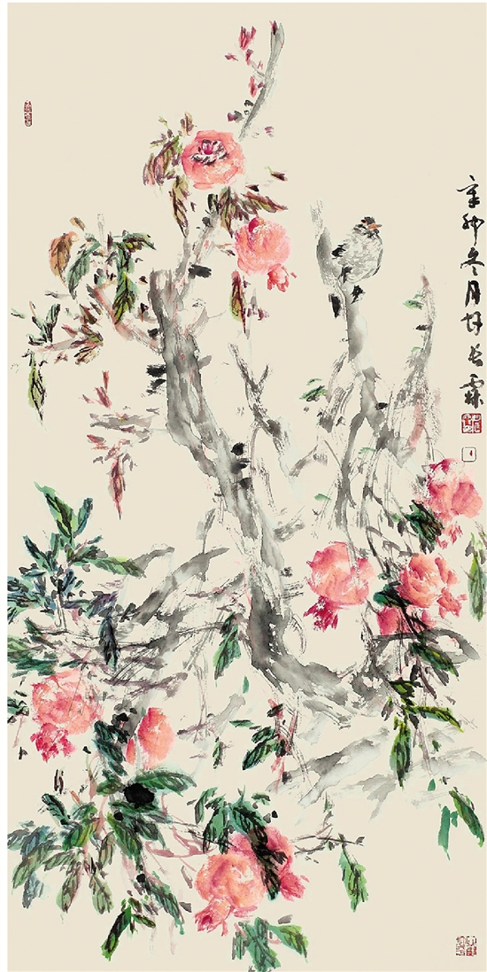 甘长霖 红石榴 彩墨纸本 153×84cm