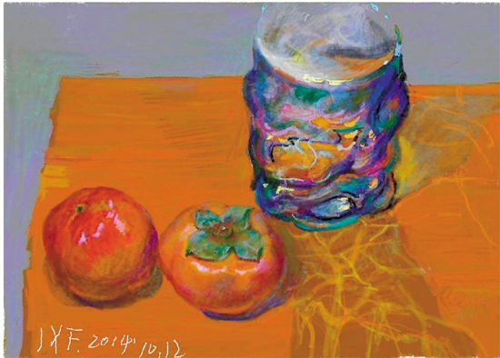 | 2014.10.12 夜,柿子 手机绘制 J君夜访,“外天”冷不防的冷,楼上咖啡馆里热乎,J君掏出两只不大不小硬柿子,要看我画,柿子和画事便成了话头扯开了…… 于画道而言我长时间在门外转,提笔也就300刚过65天,其间凡画事也多是听和看,时会走神跑到自已的画里,自我感动…… 人活到这个岁数,感动常自发于回忆,其实绘画就是这么样的手艺活。老秦地乡野山间多出柿子,青黑如铁铸的枝杆挂上点点串串的火红色,那份香滑甜软的冷艳在晚秋到初冬便是我眼眸的跃动,还有揉搓在印记中的一丝感伤…… 今夜J君和两柿子让我感动,在不到巴掌大的手机上画柿子,我知道柿子也在画我…… |