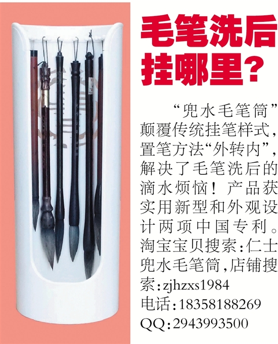 “兜水毛笔筒”颠覆传统挂笔样式,置笔方法“外转内”,解决了毛笔洗后的滴水烦恼!产品获实用新型和外观设计两项中国专利。淘宝宝贝搜索:仁士兜水毛笔筒,店铺搜索:zjhzxs1984