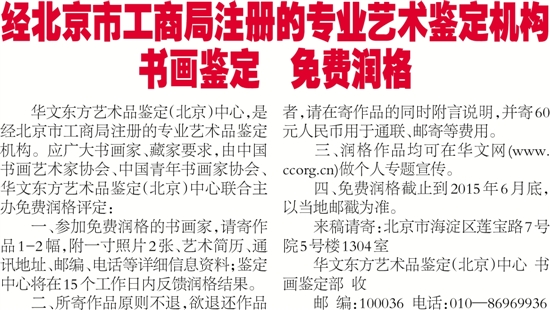 华文东方艺术品鉴定(北京)中心,是经北京市工商局注册的专业艺术品鉴定机构。应广大书画家、藏家要求,由中国书画艺术家协会、中国青年书画家协会、华文东方艺术品鉴定(北京)中心联合主办免费润格评定: