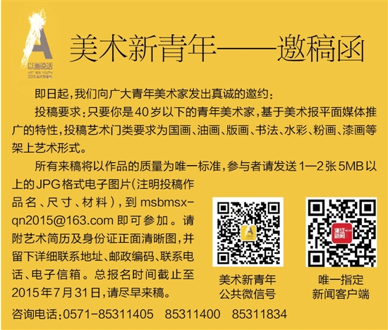 所有来稿将以作品的质量为唯一标准,参与者请发送1—2张5MB以上的JPG格式电子图片(注明投稿作品名、尺寸、材料),到msbmsxqn2015@163.com即可参加。请附艺术简历及身份证正面清晰图,并留下详细联系地址、邮政编码、联系电话、电子信箱。总报名时间截止至2015年7月31日,请尽早来稿。