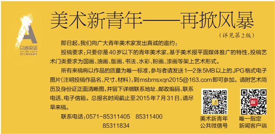 所有来稿将以作品的质量为唯一标准,参与者请发送1—2张5MB以上的JPG格式电子图片(注明投稿作品名、尺寸、材料),到msbmsxqn2015@163.com即可参加。请附艺术简历及身份证正面清晰图,并留下详细联系地址、邮政编码、联系电话、电子信箱。总报名时间截止至2015年7月31日,请尽早来稿。