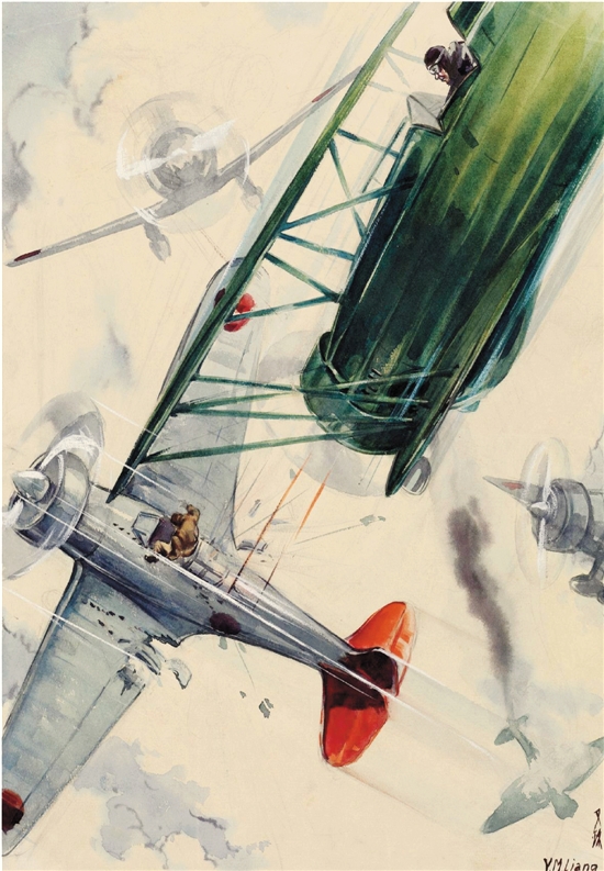 梁又铭 武汉二一八空战 1938年 水彩画 42×30cm