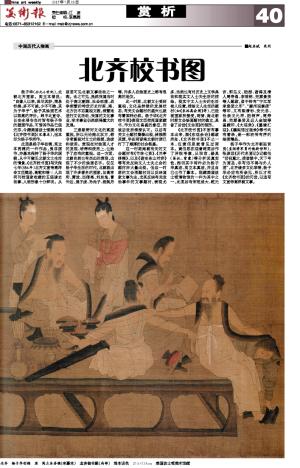 此图是杨子华创稿,阎立本再稿的一件作品,虽非原作,亦基本保持了杨子华的原貌,从中可窥见北朝文士生活的情景。《北齐校书图》写天保七年(556年)北齐文宣帝高洋命文臣樊逊、高乾和等11人共同刊校国家收藏的五经诸史故事,人物形象十分鲜明。从兹图可见北朝文事活动之一斑。由之可见,虽然我国当时处于南北割据、社会动荡、战争频繁的特定历史时期,南、北方仍不忘重视文教,频繁地进行文化活动,我国的文化事业、学术事业仍然获得重大的发展。