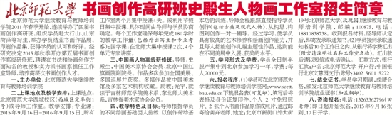 二、上课地点及教学安排:上课地点:北京师范大学西城校区(西城区定阜街1号)或导师工作室。教学安排:专业课:2015年9月16日-2016年9月15日,所有工作室两个月集中授课4天。或利用节假日集中授课,具体时间由导师与学员协商确定。每个工作室确保每年完成180学时的教学工作量(包括外出写生和专业考察);国学课:在北师大集中授课2次,4个单元专家讲座。