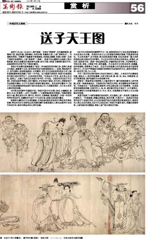 根据李公麟《送子天王图》题跋,此图应绘《瑞应本取经》中释迦牟尼降生故事,释迦牟尼的父亲净饭王和其姨母摩诃波阇波提夫人抱他去朝拜大自在天神庙天神,诸神向释迦牟尼礼拜的故事。