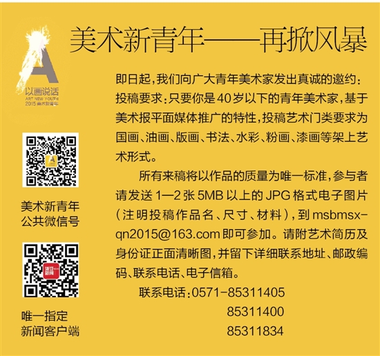 投稿要求:只要你是40岁以下的青年美术家,基于美术报平面媒体推广的特性,投稿艺术门类要求为国画、油画、版画、书法、水彩、粉画、漆画等架上艺术形式。