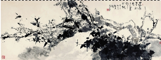 闵庚灿 运起金刚指来写竹石梅(指墨) 237×89cm 1984年