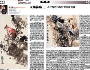 倘若当代大写意花鸟是一曲“笔墨结构”与“文化精神”的和谐乐章,那么,谢天赐充满现代写意精神、新时代气象的大写意花鸟就是曲谱中壮丽恢弘、扣人心弦的变奏乐章。他延续了再现客观世界和表现主观世界相结合的写意传统,以主观世界的表现作为创作的主导因素,在创作时强调主体自由精神的融入,又不拘泥于古今中西的审美领域。多年的从艺经验、不懈的思索与总结,以及对哲学、心理美学、符号学等诸多方面的涉猎,使他总结出了一套较为完整的理论体系。他归纳的中国画“三结构”论(视觉结构、心理结构、笔墨结构)和中国画的“三笔画法”是对中国画实质的冶炼。