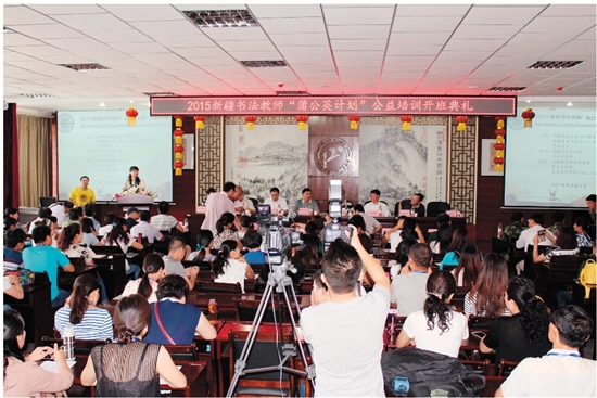 7月10日上午,2015新疆书法教师蒲公英计划公益培训开班典礼进行中