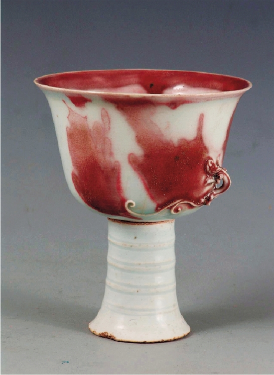 ◀元代釉里红彩斑贴塑螭龙纹高足转杯