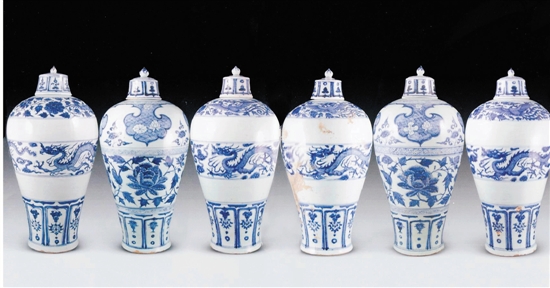 | 窖藏出土的6件元青花梅瓶 青花缠枝牡丹纹带盖梅瓶:短颈,丰肩,带盖,圆鼓腹下收,矮圈足稍稍外扬,全器纹饰多达九层,肩腹部主题纹饰为如意披肩缠枝牡丹纹,表面光洁滋润,造型饱满,视觉流畅,雍容华贵。这6个梅瓶盖内壁露胎处和底部分别写着墨书“礼”“乐”“书”“数”“射”“御”等儒家六艺。 |