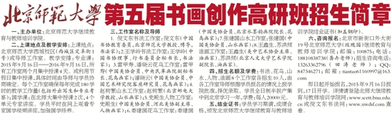 二、上课地点及教学安排:上课地点:北京师范大学西城校区(西城区定阜街1号)或导师工作室。教学安排:专业课:2015年9月16日——2016年9月16日,所有工作室两个月集中授课4天。或利用节假日集中授课,具体时间由导师与学员协商确定。每个工作室确保每年完成180学时的教学工作量(包括外出写生和专业考察);国学课:在北师大集中授课2次,4个单元专家讲座。学员平时在网上观看专家国学视频讲座,加强国学修养。