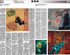 “天”,指宇宙天体图像,这是周韶华最新的创作领域。这里有少数作品直接描绘美国航空航天局公布的天文摄影,或许周韶华的新灵感就是被哪类摄影激发出来的。在这个创作领域中,我最喜欢《火星冲日》、《吸光的星云》、《大爆炸后诞生了太阳系》等作品,这些作品完全摆脱了天文科普挂图的残痕,转化成了周韶华的太空梦境。这些作品将周韶华的浪漫主义、乐观主义、崇尚大美、迷恋新局等等推向了更自由的想象空间,使他对水拓、冲色、拼贴等新技法新材料的探求热情得到了更自由的释放,使他 “五彩斑斓的光色世界必将给中国水墨画带来革新的曙光”的主张得到了更尽兴的发挥。难得的是,材料和色彩的自由探索与太空中的自由遨游正在形成某种良性互动。