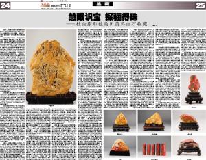 前些天,我应邀来到浙江省收藏家协会副会长、著名收藏家、浙江省古越轩书画社主人杜金康先生的办公室聚谈。未等坐下,他就引领我走进了他的田黄、鸡血石藏品陈列室。