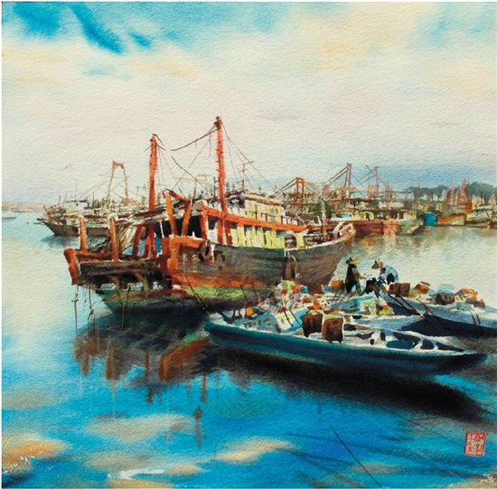 曹剑新(广东) 汕尾翡翠湾渔港 水彩画