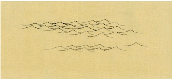 勾水纹时要一峰接一峰,一层一层地画。水纹的组合忌画成装饰图案。用笔中锋,笔墨均壮。注意水纹峰尖的转笔。勾勒完成后,用淡墨层层烘染。烘染时注意水雾的变化,忌板滞迫塞。