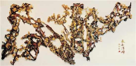 文化交流中心大堂上方悬挂的中国巨幅熔铜壁画作品《春和清妍》