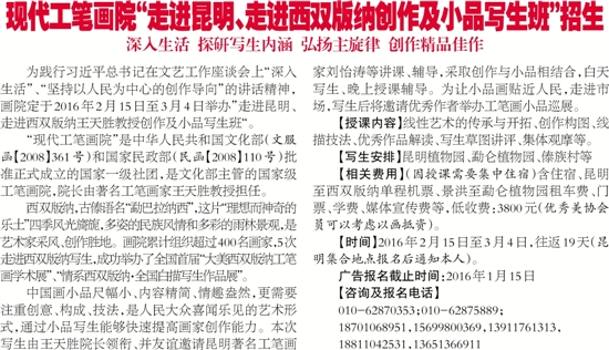 为践行习近平总书记在文艺工作座谈会上“深入生活”、“坚持以人民为中心的创作导向”的讲话精神,画院定于2016年2月15日至3月4日举办”走进昆明、走进西双版纳王天胜教授创作及小品写生班“。